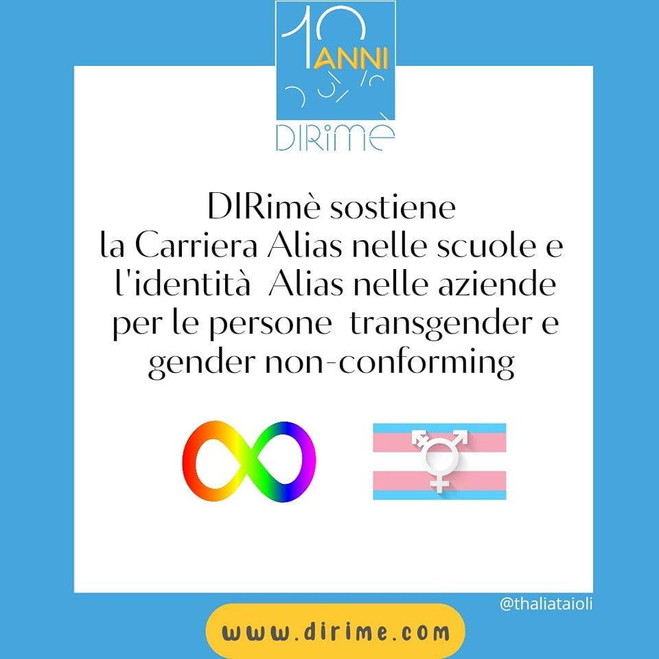 DIRimè sostiene la partecipazione sociale e il diritto allo studio di tutt* e sostiene la Carriera Alias. In associazione, ci impegnamo a utilizzare il nome scelto dal socio o socia nelle comunicazioni interne in attesa del completamento degli adempimenti burocratici di legge che permettano di adeguare il nome anche sulla sua tessera associativa e la varia documentazione.
