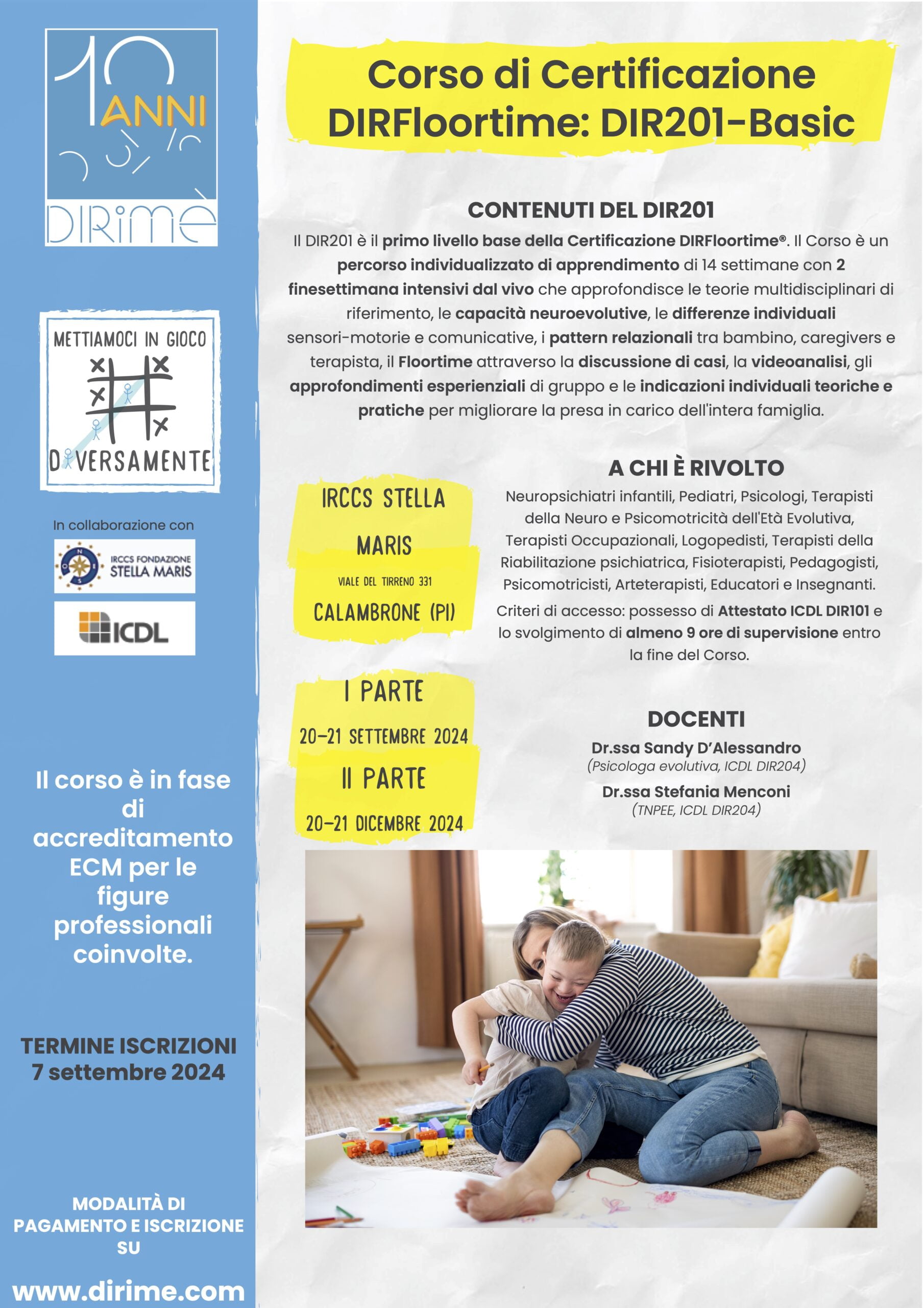 Il Corso DIR201-Basic è il primo livello formativo della Certificazione DIRFloortime. Il corso ha durata di 14 settimane organizzate in 2 finesettimana intensivi in presenza presso l’IRCCS Stella Maris di Pisa.