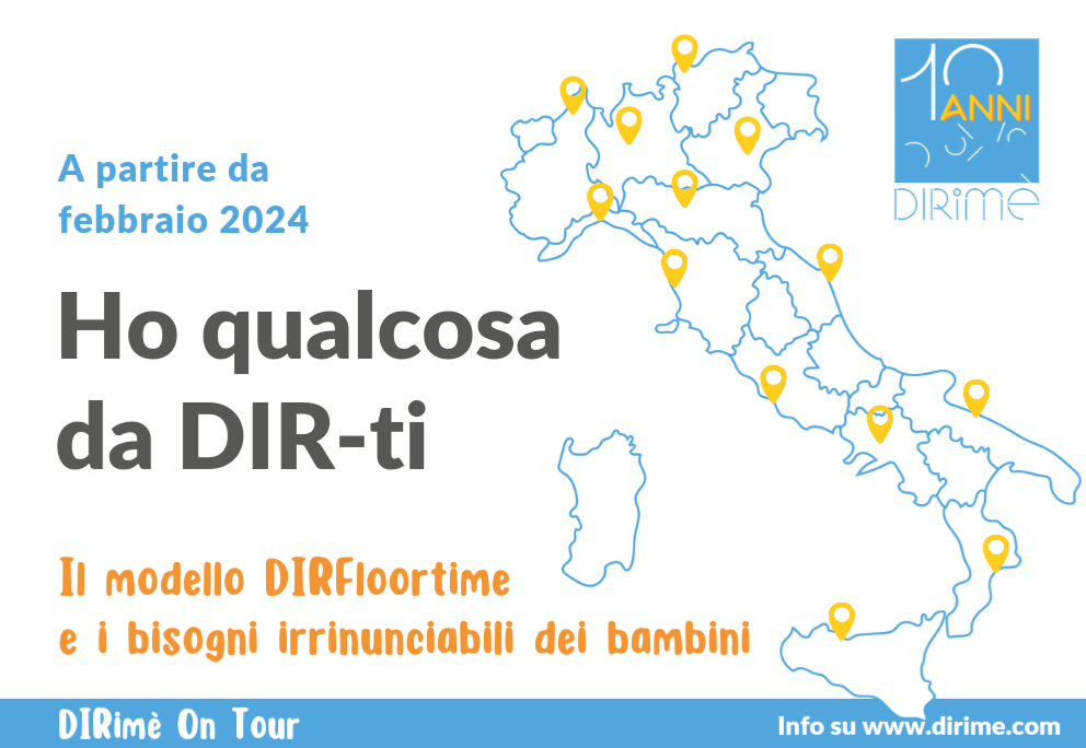 Nel 2024 la nostra Associazione festeggia il decennale e, per celebreare questo importante traguardo, abbiamo organizzato un tour DIRimè in tutta Italia. Si tratta di incontri gratuiti di sensibilizzazione DIRFloortime su tutto il territorio italiano con professionisti multidisciplinari, rappresentanti delle amministrazioni locali e famiglie che offrono la propria testimonianza diretta.