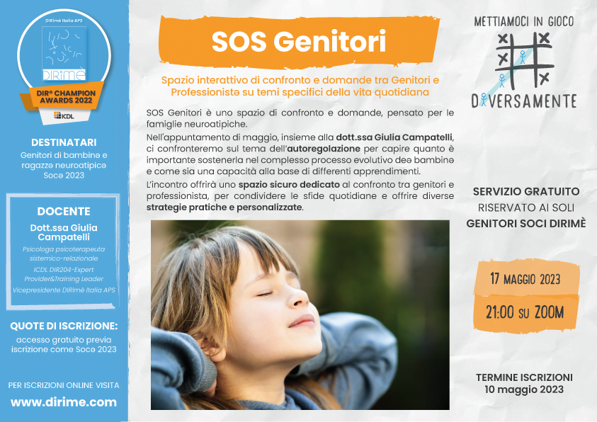 SOS Genitori permette di fare domande, ricevere suggerimenti e pre-consulenze, confrontarsi con altre famiglie e con esperti di diverse aree neuroevolutive, in prospettiva DIRFloortime di rispetto del bambino, dei suoi punti di forza, e del pieno coinvolgimento genitoriale.