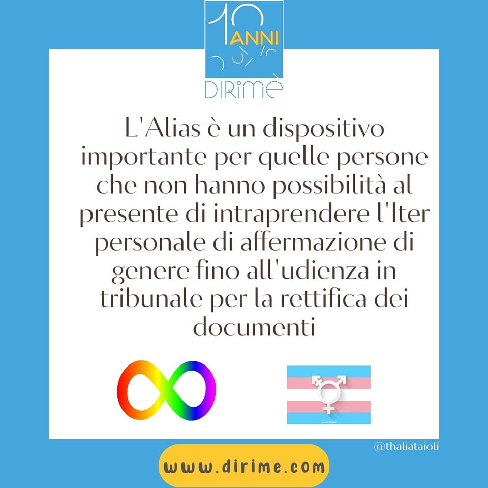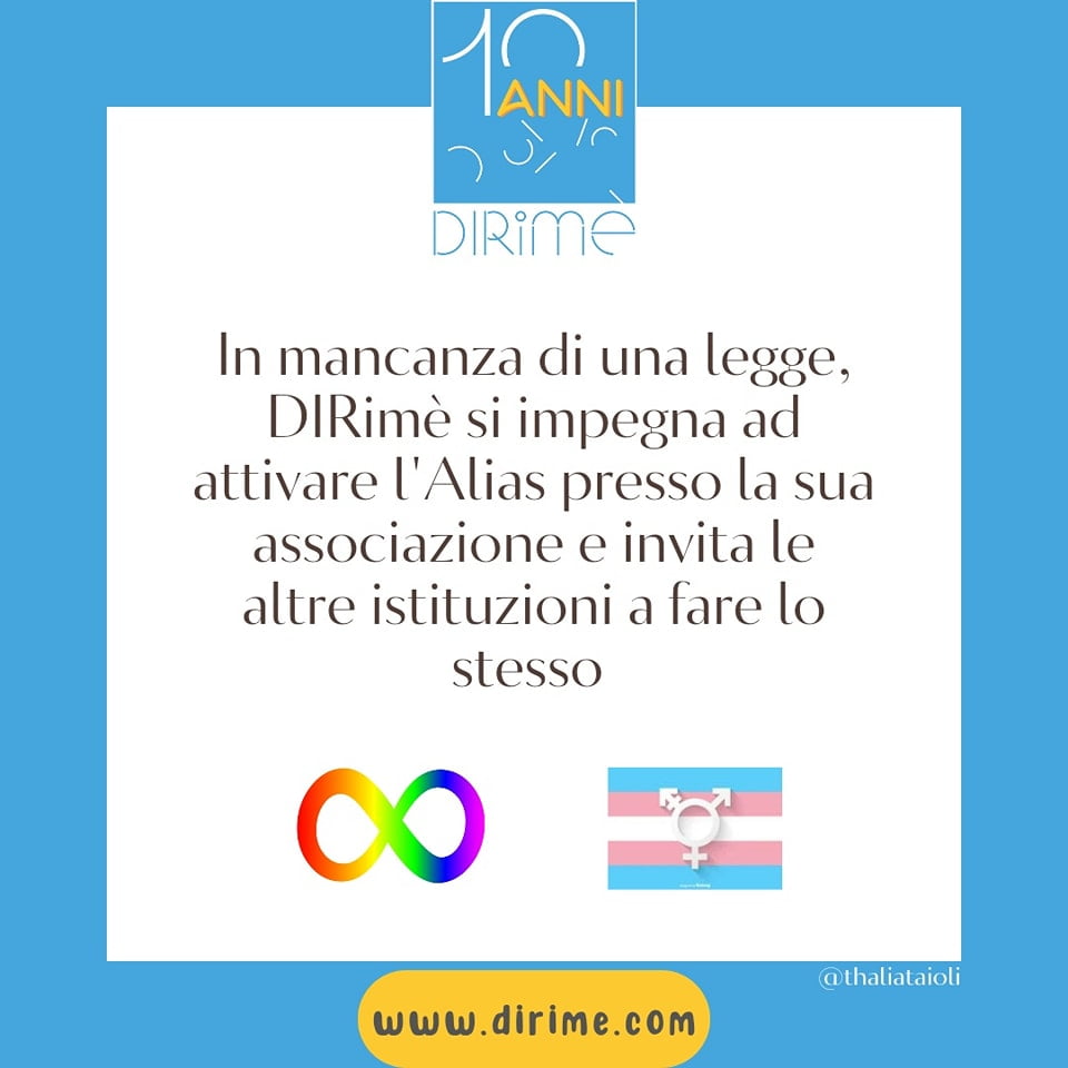 DIRimè sostiene la partecipazione sociale e il diritto allo studio di tutt* e sostiene la Carriera Alias. In associazione, ci impegnamo a utilizzare il nome scelto dal socio o socia nelle comunicazioni interne in attesa del completamento degli adempimenti burocratici di legge che permettano di adeguare il nome anche sulla sua tessera associativa e la varia documentazione.