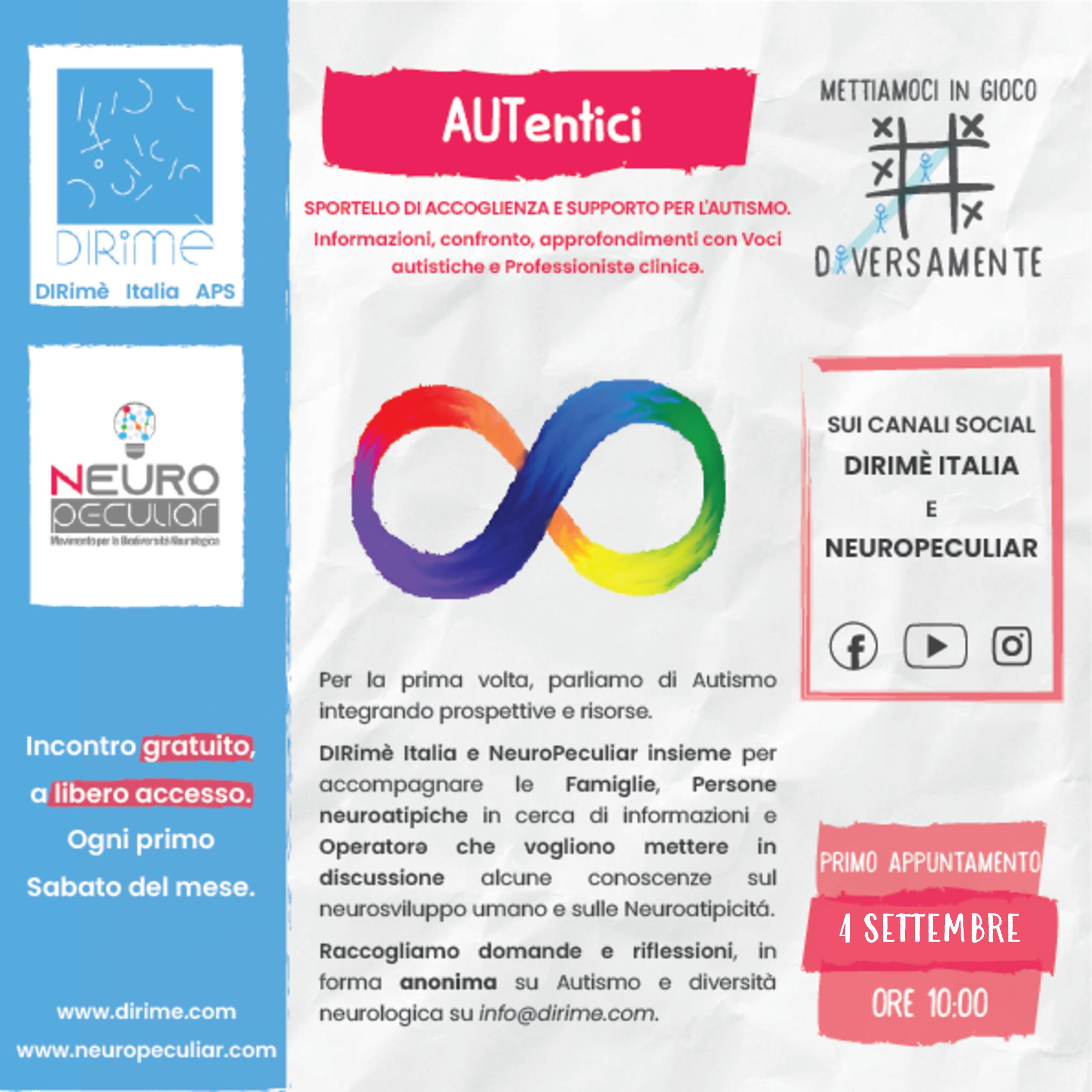 Ogni primo Sabato del mese, a partire da Sabato 5 Giugno 2021, in diretta sui canali Facebook e Youtube di DIRimè Italia e NeuroPeculiar.