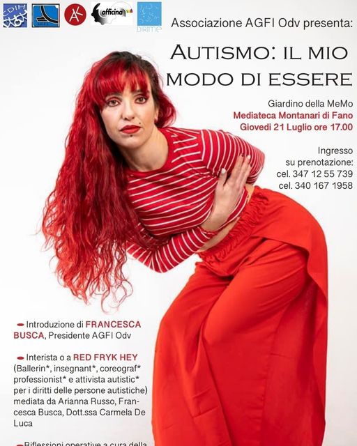 Nel giardino della MeMo di Fano, nelle Marche, insieme alla Dott.ssa Carmela De Luca, Francesca Busca (Presidente AGFI), Arianna Russo e con la partecipazione di Red, ballerinə professionista e attivista autisticə, parleremo di autismo e neurodiversità umana, convivenza delle differenze e prospettiva evolutivo-relazionale per il rispetto e l’accoglienza di tutti i i profili neurologici.