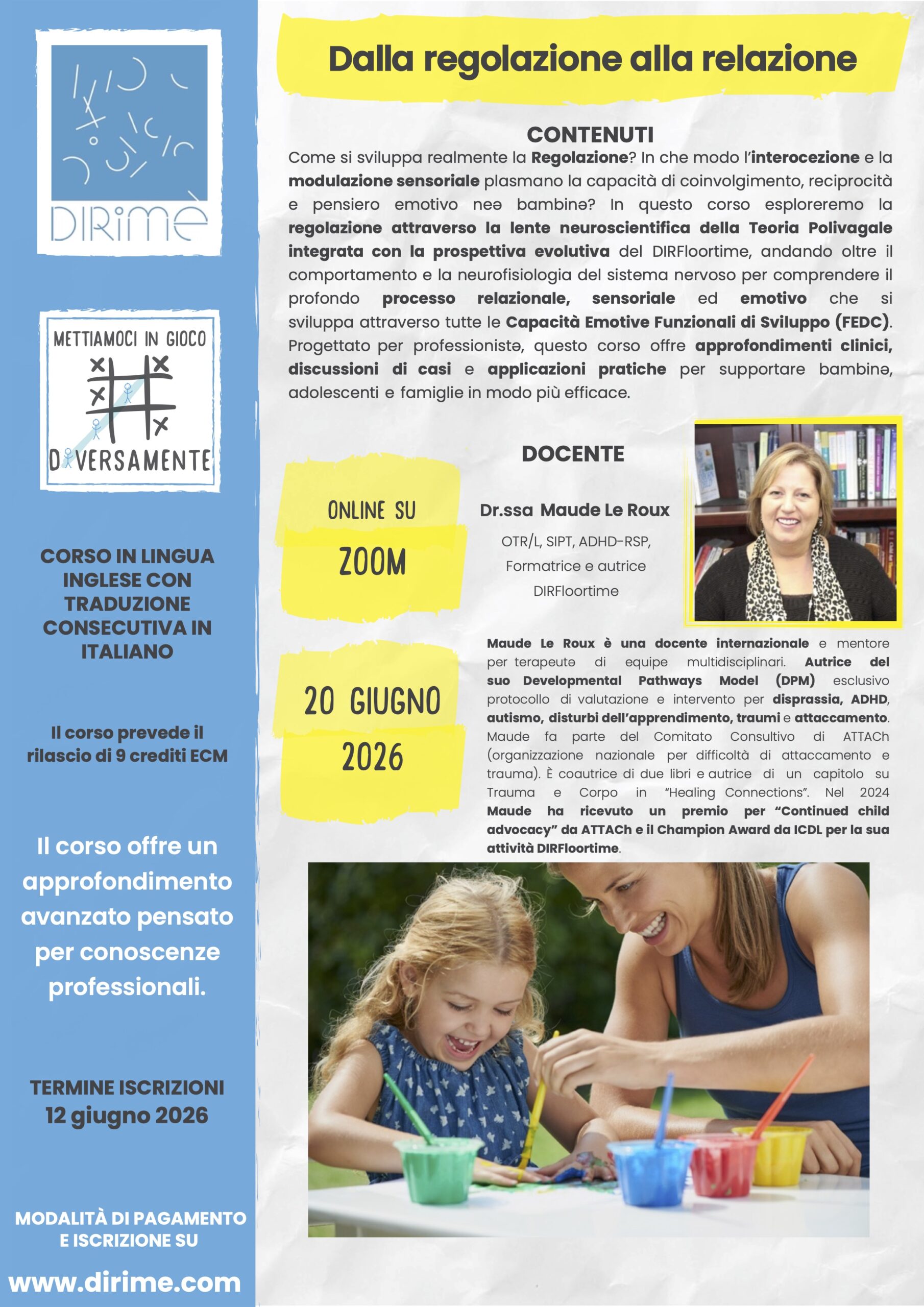 In questo corso esploreremo la regolazione attraverso la lente neuroscientifica della Teoria Polivagale integrata con la prospettiva evolutiva del DIRFloortime, andando oltre il comportamento e la neurofisiologia del sistema nervoso per comprendere il profondo processo relazionale, sensoriale ed emotivo che si sviluppa attraverso tutte le Capacità Emotive Funzionali di Sviluppo (FEDC).