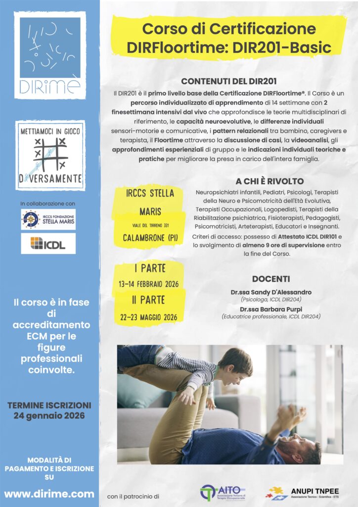 Il Corso DIR201-Basic è il primo livello formativo della Certificazione DIRFloortime. Il corso ha durata di 14 settimane organizzate in 2 finesettimana intensivi in presenza presso l’IRCCS Stella Maris di Pisa.