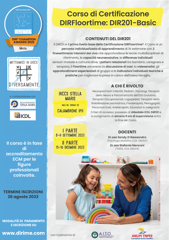 Il Corso DIR201-Basic è il primo livello formativo della Certificazione DIRFloortime. Il corso ha durata di 14 settimane organizzate in 2 finesettimana intensivi in presenza presso l’IRCCS Stella Maris di Pisa.