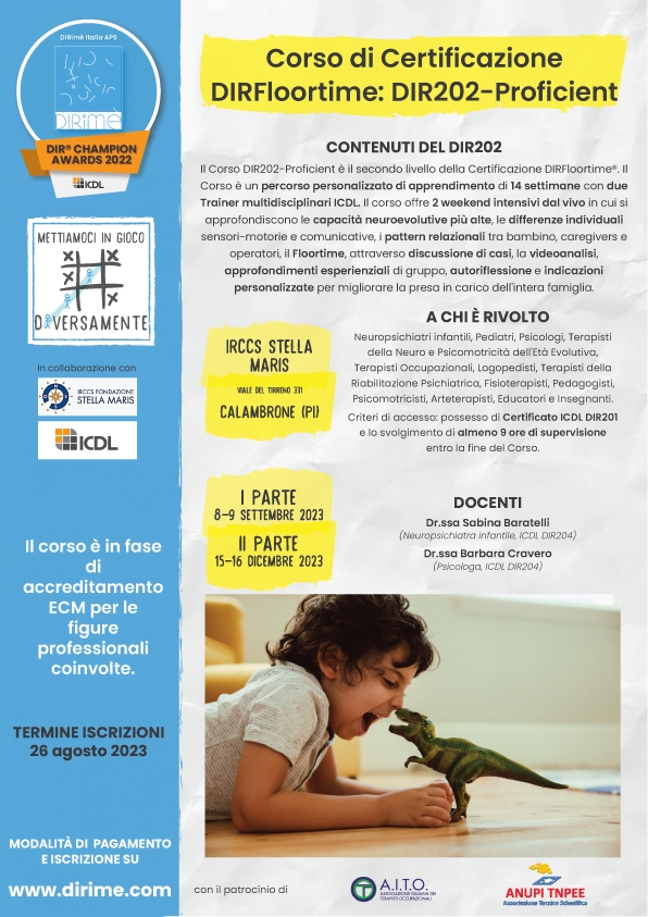 Il Corso DIR202-Proficient è il secondo livello formativo della Certificazione DIRFloortime. Il corso ha durata di 14 settimane organizzate in 2 finesettimana intensivi in presenza presso l’IRCCS Stella Maris di Pisa.