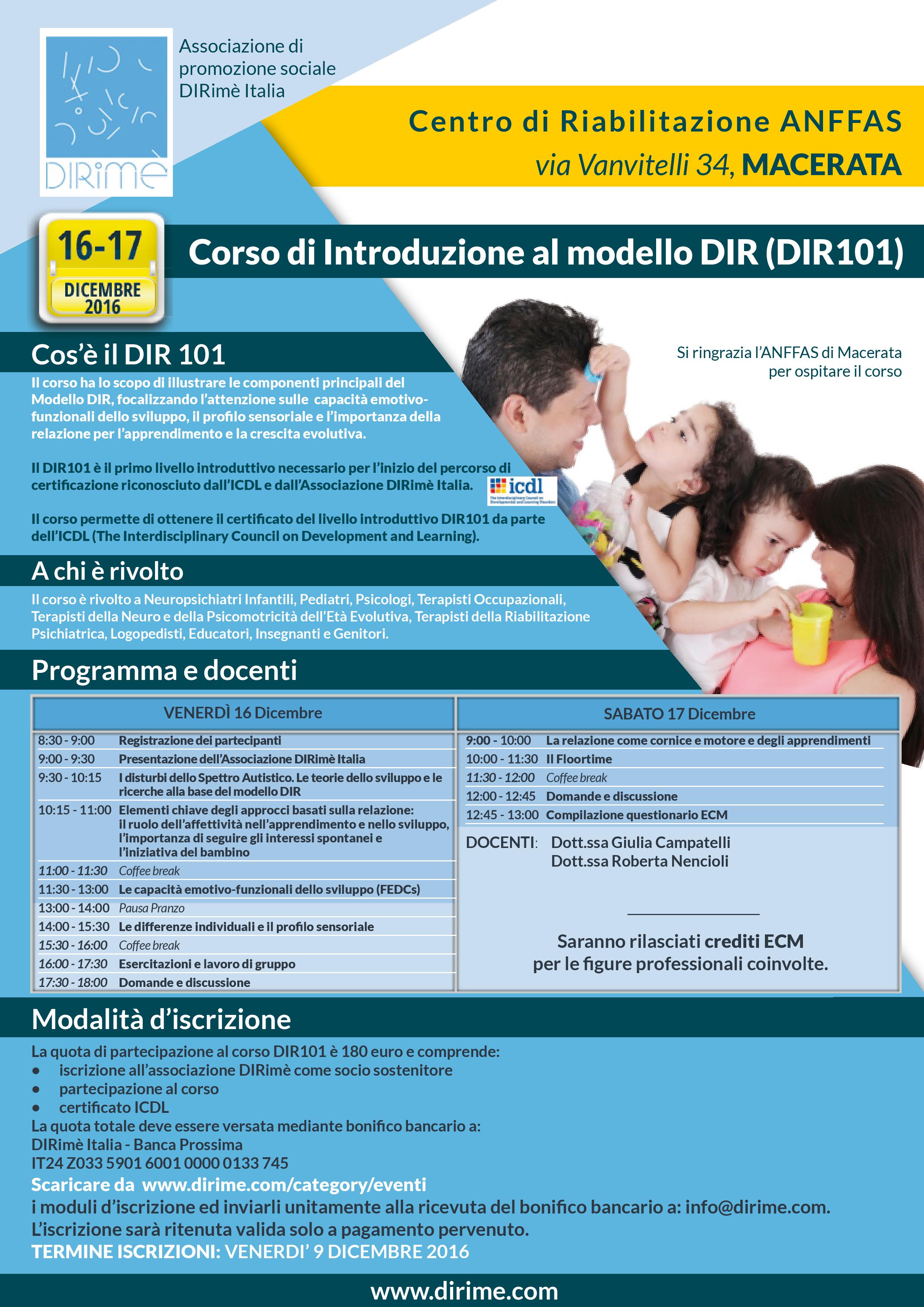 DIRimè, grazie alla collaborazione con ANFFAS Macerata è lieta di offrire l’ultima occasione formativa per il 2016: il corso introduttivo sul modello DIR (DIR101) certificato dall’ICDL (Interdisciplinary Council of Development and Learning).