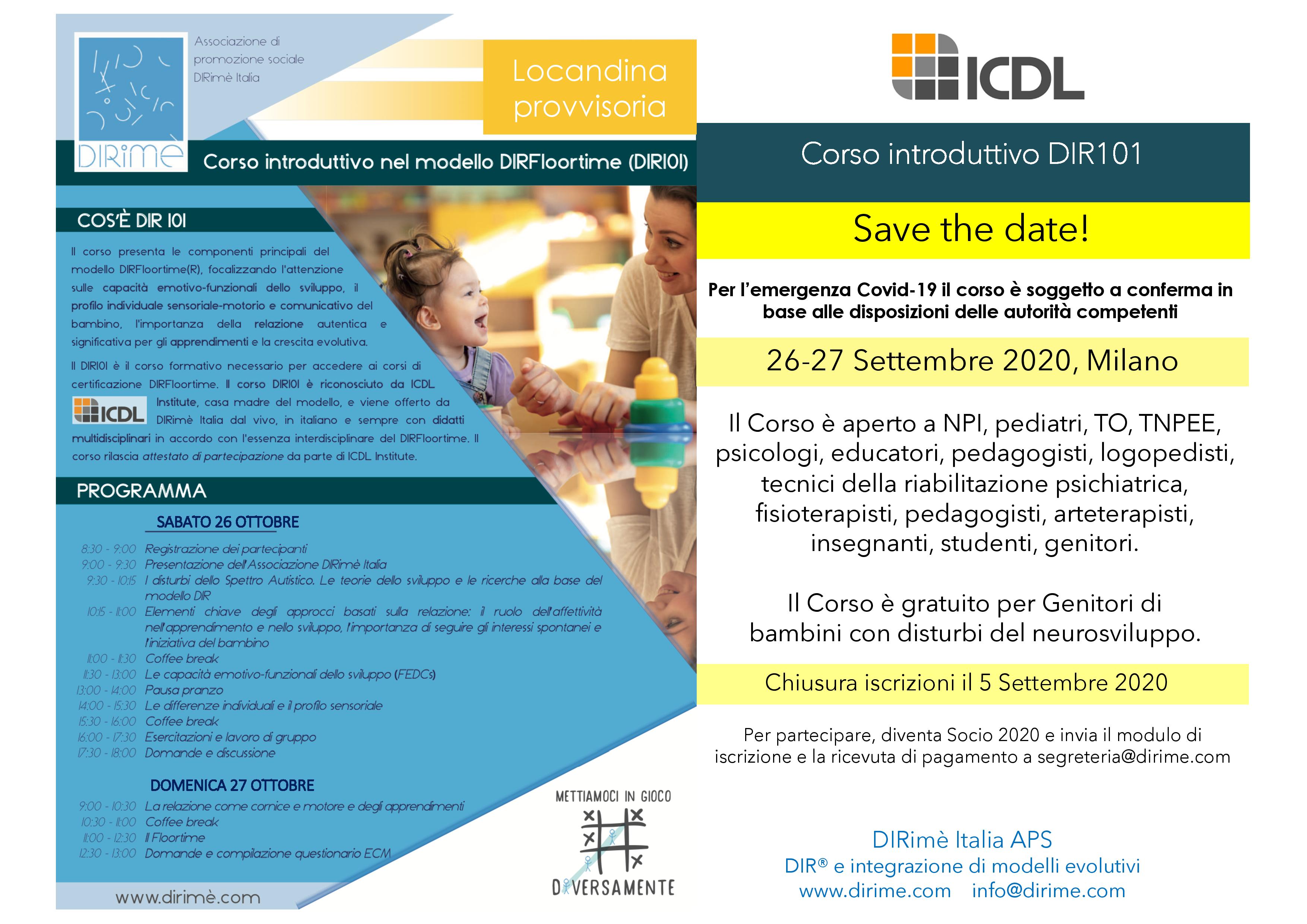 E’ il Corso Introduttivo al DIRFloortime riconosciuto e certificato da ICDL Institute (Interdisciplinary Council of Development and Learning), casa madre del modello DIRFloortime®. Il DIR101 è il primo step necessario per poter accedere al percorso di Certificazione nel Modello DIRFloortime®. Il corso rilascia l’Attestato di Partecipazione direttamente da ICDL Institute e permette di avere accesso al livello di formazione successiva (Corso di certificazione base DIR201) all’intero del piano formativo di Certificazione per diventare terapista DIRFloortime®.