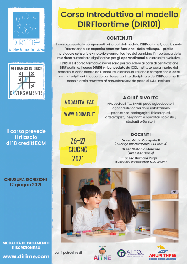 E’ il Corso Introduttivo al DIRFloortime riconosciuto e certificato da ICDL Institute (Interdisciplinary Council of Development and Learning), casa madre del modello DIRFloortime®. Il DIR101 è il primo step necessario per poter accedere al percorso di Certificazione nel Modello DIRFloortime®. Il corso rilascia l’Attestato di Partecipazione direttamente da ICDL Institute e permette di avere accesso al livello di formazione successiva (Corso di certificazione DIR201-Basic) all’intero del piano formativo di Certificazione per diventare terapista DIRFloortime®.