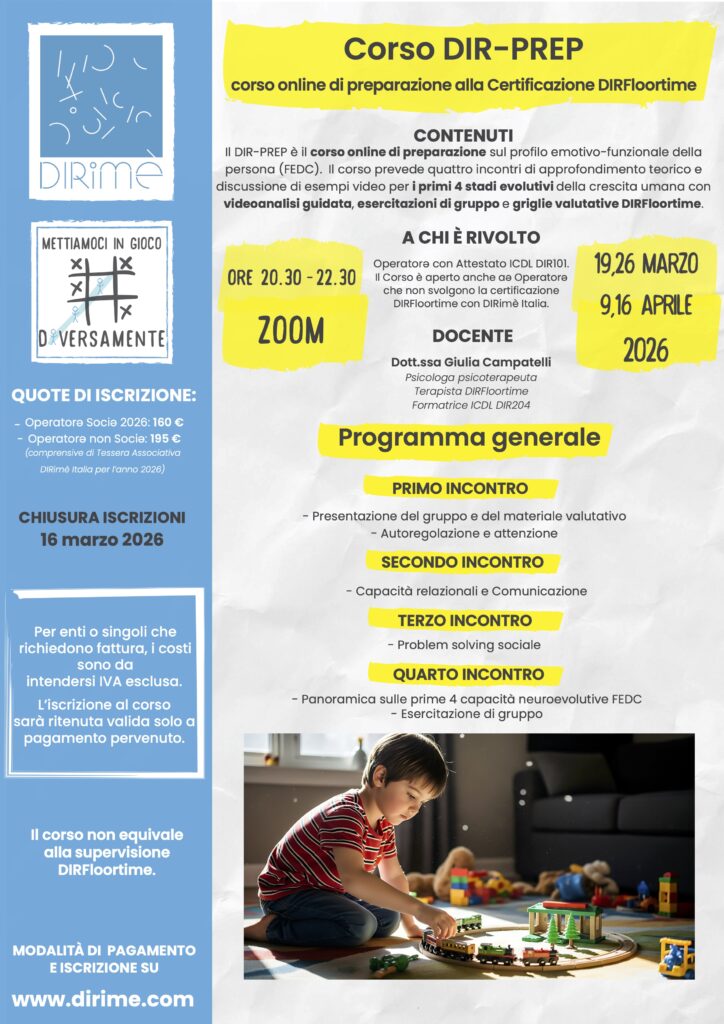 Ecco il Corso online DIR-PREP: 4 incontri online con una docente DIRFloortime per approfondire gli aspetti teorici più importanti all’inizio della certificazione e per familiarizzare con la videoanalisi e la lettura dei segnali del bambino sul proprio profilo individuale.