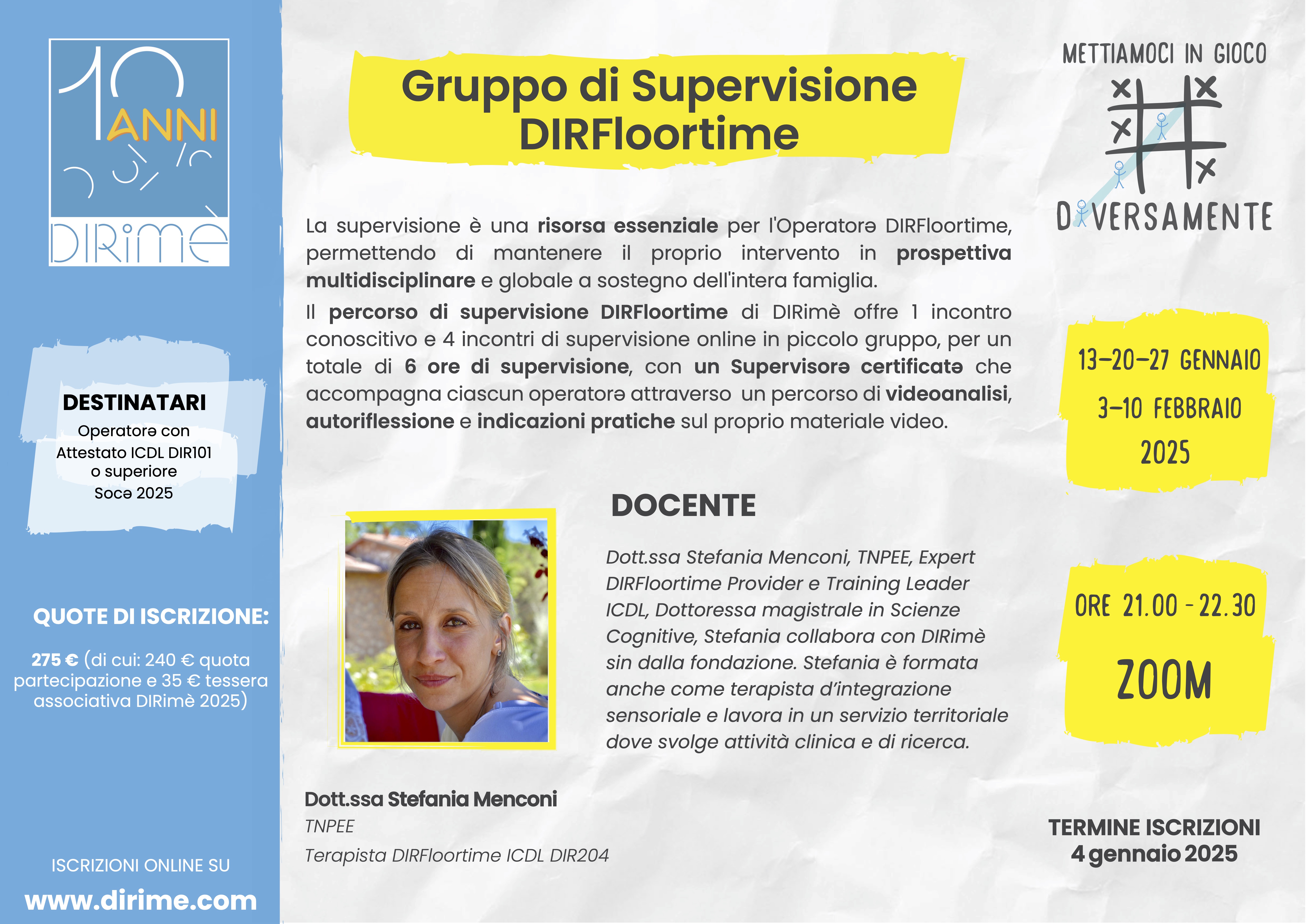 La supervisione è una risorsa essenziale per l’Operatorə DIRFloortime, permettendo di mantenere il proprio intervento in prospettiva multidisciplinare e globale a sostegno dell’intera famiglia.