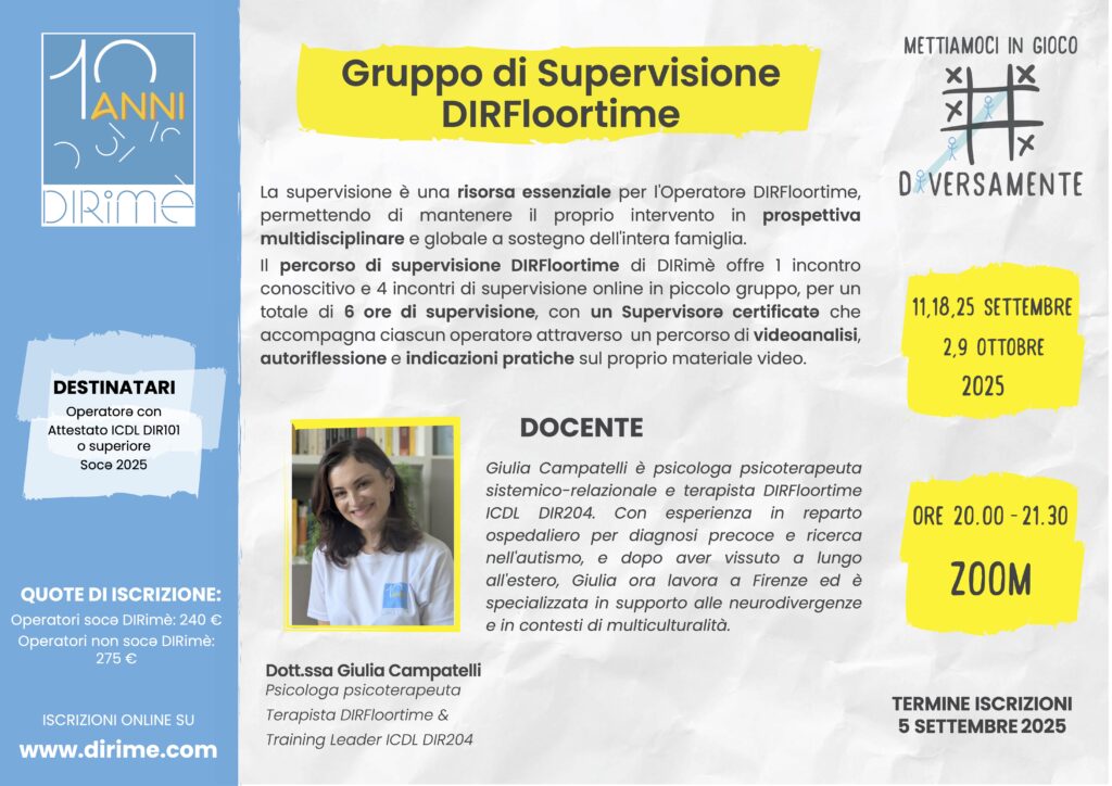 La supervisione è una risorsa essenziale per l’Operatorə DIRFloortime, permettendo di mantenere il proprio intervento in prospettiva multidisciplinare e globale a sostegno dell’intera famiglia.