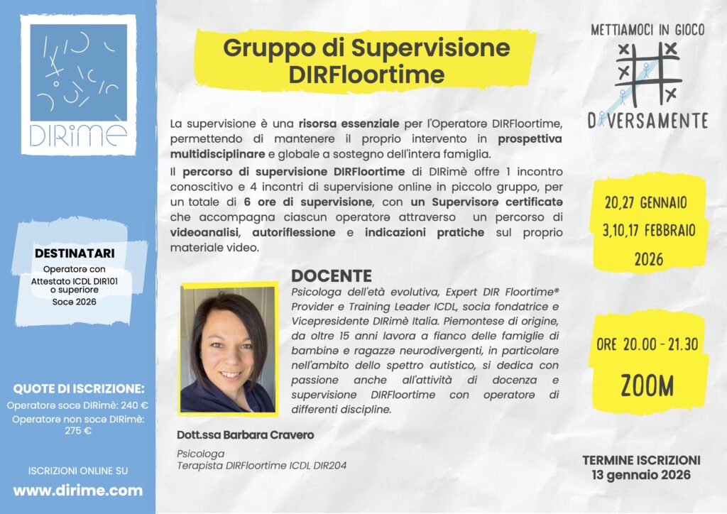 Il gruppo di supervisione DIRFloortime di DIRimè offre 1 incontro conoscitivo e 4 incontri di supervisione online in piccolo gruppo, per un totale di 6 ore di supervisione, con un Supervisorə certificatə che accompagna ciascun operatorə attraverso un percorso di videoanalisi, autoriflessione e indicazioni pratiche sul proprio materiale video.