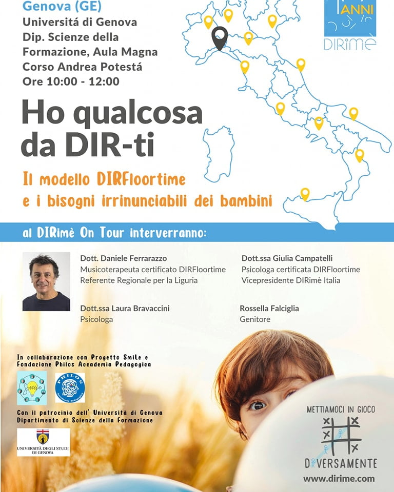 Nel 2024 la nostra Associazione festeggia il decennale e, per celebrare questo importante traguardo, abbiamo organizzato un tour DIRimè in varie regioni d’Italia. Si tratta di incontri gratuiti di sensibilizzazione DIRFloortime su tutto il territorio italiano con professionisti multidisciplinari, rappresentanti delle amministrazioni locali e famiglie che offrono la propria testimonianza diretta. Gli incontri sono aperti liberamente alla cittadinanza e in collaborazione con le realtà locali territoriali.