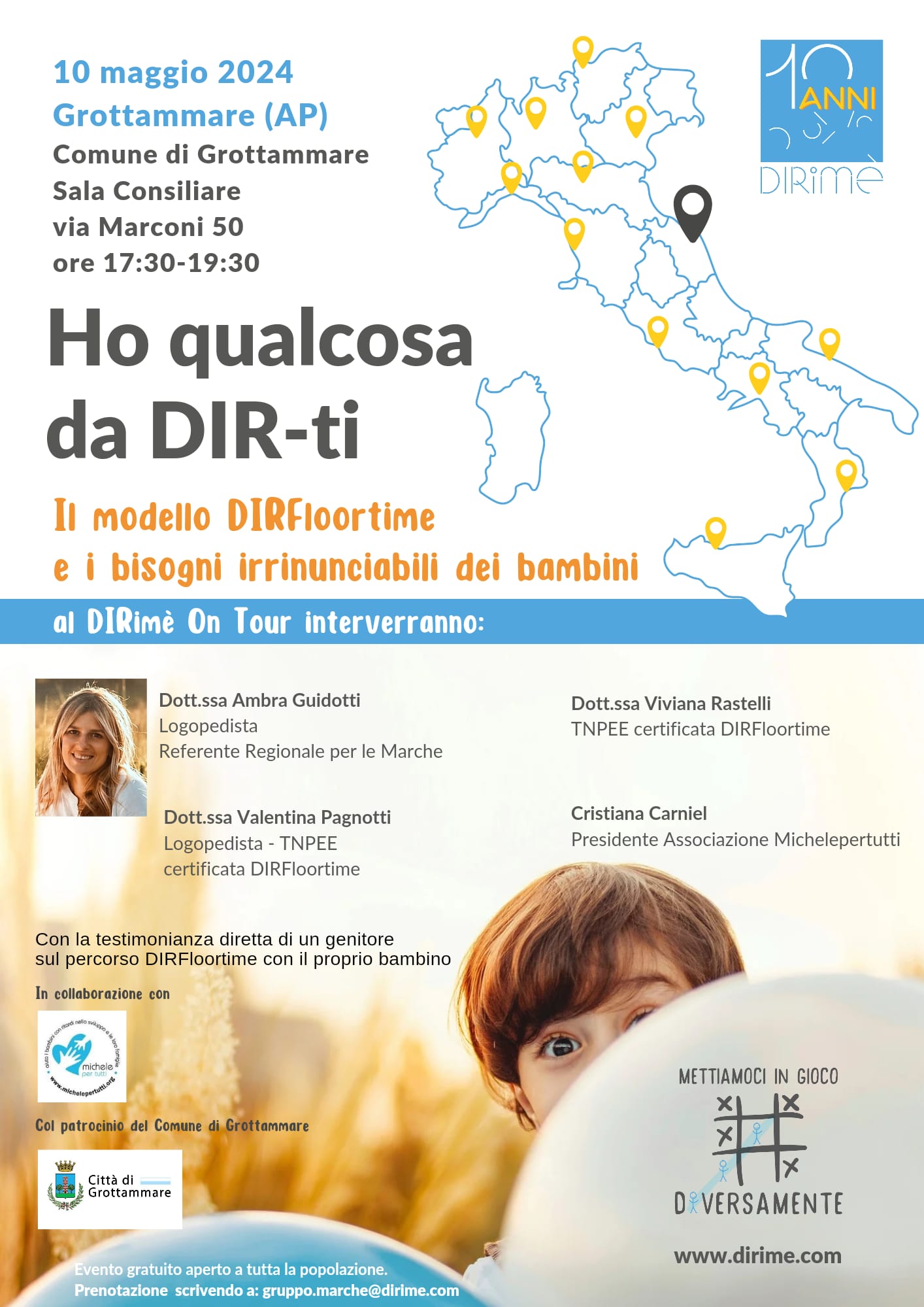 Nel 2024 la nostra Associazione festeggia il decennale e, per celebrare questo importante traguardo, abbiamo organizzato un tour DIRimè in varie regioni d’Italia. Si tratta di incontri gratuiti di sensibilizzazione DIRFloortime su tutto il territorio italiano con professionisti multidisciplinari, rappresentanti delle amministrazioni locali e famiglie che offrono la propria testimonianza diretta. Gli incontri sono aperti liberamente alla cittadinanza e in collaborazione con le realtà locali territoriali.