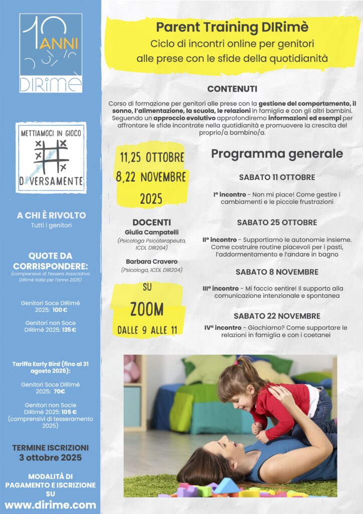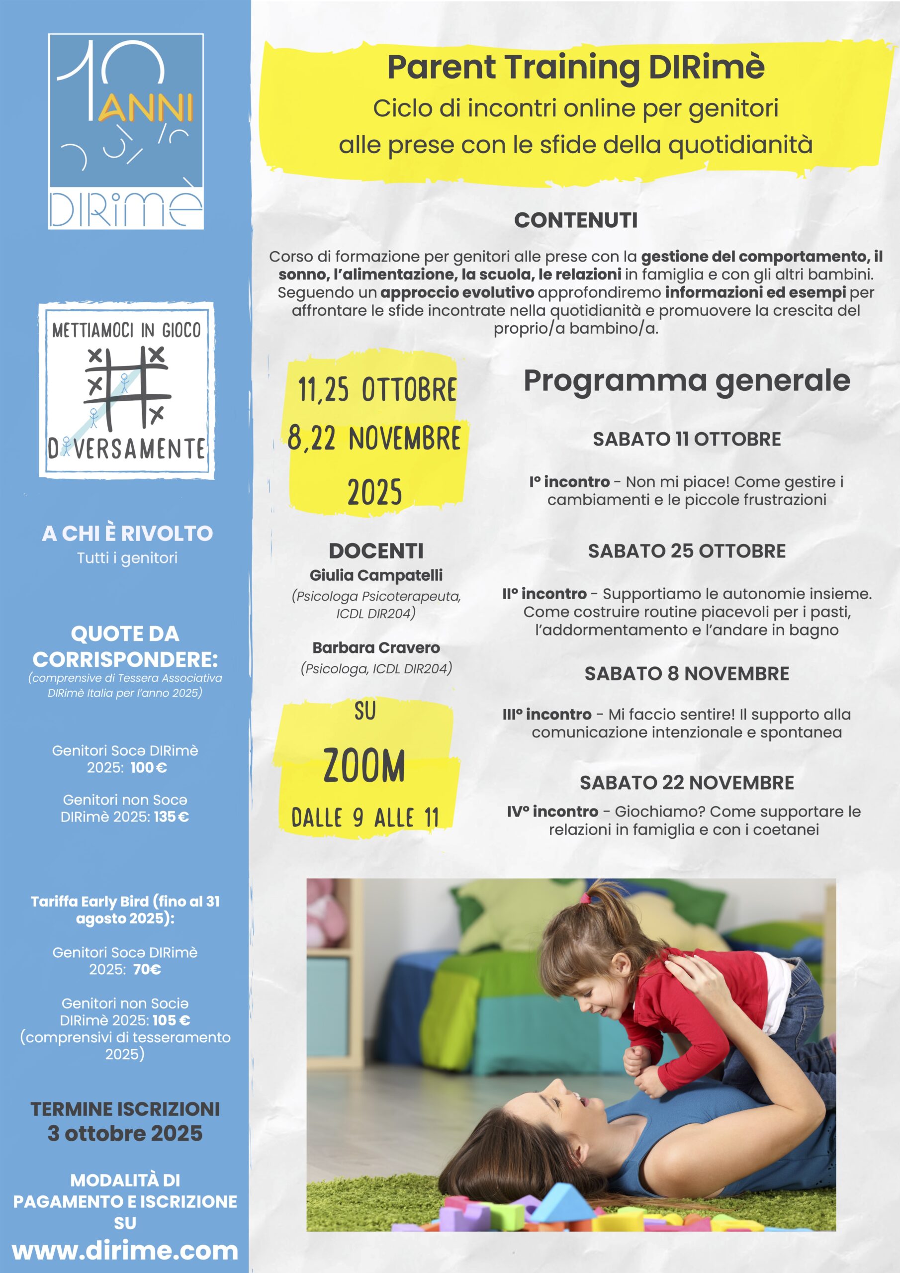 Corso di formazione per genitori alle prese con la gestione del comportamento, il sonno, l’alimentazione, la scuola, le relazioni in famiglia e con gli altri bambini. Seguendo un approccio evolutivo approfondiremo informazioni ed esempi per affrontare le sfide incontrate nella quotidianità e promuovere la crescita del proprio/a bambino/a.