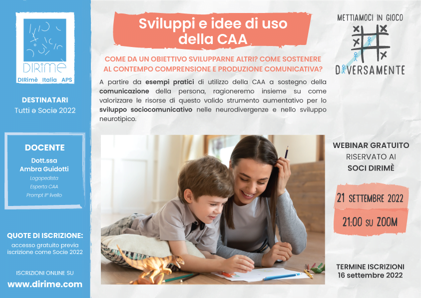 A partire da esempi pratici di utilizzo della CAA a sostegno della comunicazione della persona, ragioneremo insieme su come valorizzare le risorse di questo valido strumento aumentativo per lo sviluppo sociocomunicativo nelle neurodivergenze e nello sviluppo neurotipico.