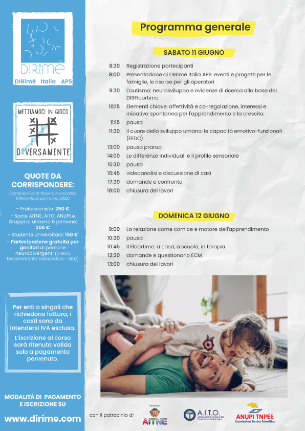 Il corso DIR101 presenta i principi cardine del modello DIRFloortime®e la sua prospettiva bio-psico-sociale di sostegno alla persona, alla famiglia e alla scuola.