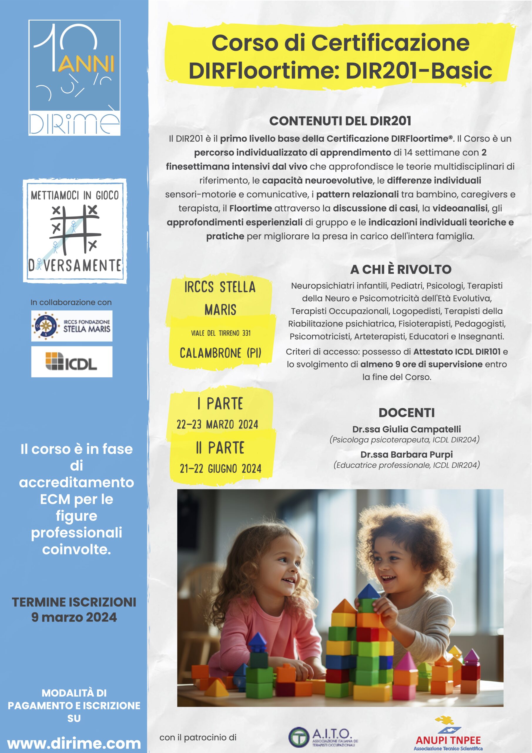 Il Corso DIR201-Basic è il primo livello formativo della Certificazione DIRFloortime. Il corso ha durata di 14 settimane organizzate in 2 finesettimana intensivi in presenza presso l’IRCCS Stella Maris di Pisa.