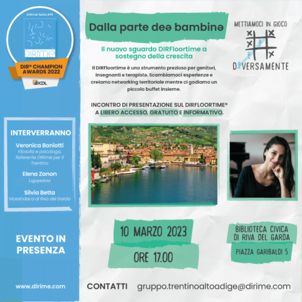La nostra Veronica Boniotti, filosofa e psicologa e Referente per il Trentino, organizza un incontro aperto alla cittadinanza nella Biblioteca Civica di Riva del Garda venerdì 10 marzo dalle 17:00. Insieme alla Vicesindaca di Riva del Garda, la dott.ssa Silvia Betta, Veronica presenterà il DIRFloortime come strumento prezioso per genitori, insegnanti e terapistə che vogliono supportare profondamente, e in modo etico, la crescita e l’apprendimento. All’incontro interverrà anche la dott.ssa Elena Zanon, Logopedista, che racconterà la sua esperienza autobiografica. A conclusione dell’incontro, avremo un piccolo buffet insieme per scambiarci esperienze, domande e creare networking territoriale. Scopri di più sull’evento qui.