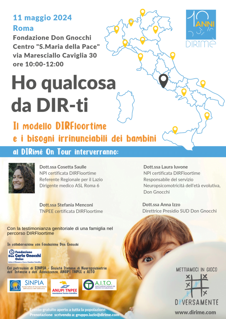 Nel 2024 la nostra Associazione festeggia il decennale e, per celebrare questo importante traguardo, abbiamo organizzato un tour DIRimè in varie regioni d’Italia. Si tratta di incontri gratuiti di sensibilizzazione DIRFloortime su tutto il territorio italiano con professionisti multidisciplinari, rappresentanti delle amministrazioni locali e famiglie che offrono la propria testimonianza diretta. Gli incontri sono aperti liberamente alla cittadinanza e in collaborazione con le realtà locali territoriali.