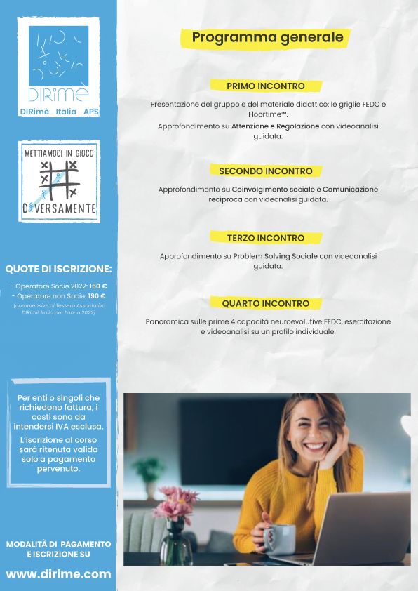 Basta esser Socə 2022 e in possesso di Attestato ICDL DIR101 per iscriversi al corso. ə Docenti presenteranno video per ciascuna capacità FEDC presentata e guideranno la videoanalisi e la discussione sulla griglie valutative FEDC e Floortime utilizzate ai Corsi di Certificazione.