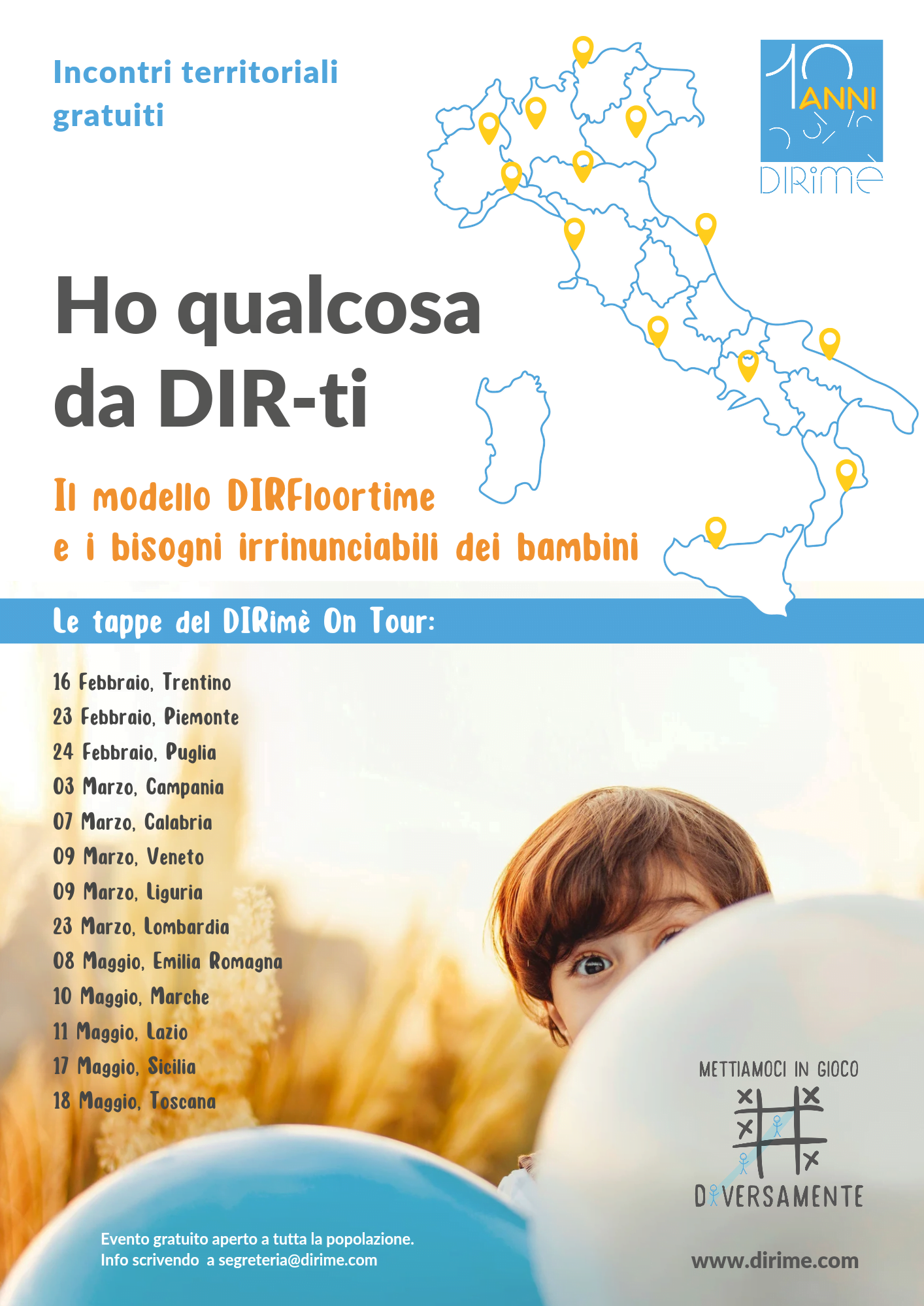 Nel 2024 la nostra Associazione festeggia il decennale e, per celebreare questo importante traguardo, abbiamo organizzato un tour DIRimè in varie regioni d’Italia. Si tratta di incontri gratuiti di sensibilizzazione DIRFloortime su tutto il territorio italiano con professionisti multidisciplinari, rappresentanti delle amministrazioni locali e famiglie che offrono la propria testimonianza diretta. Gli incontri sono aperti liberamente alla cittadinanza e in collaborazione con le realtà locali territoriali.
