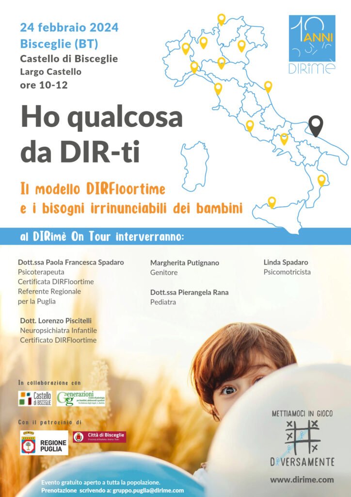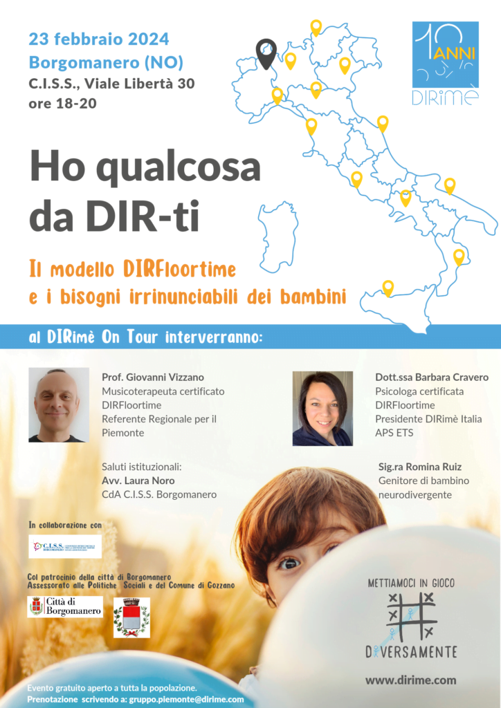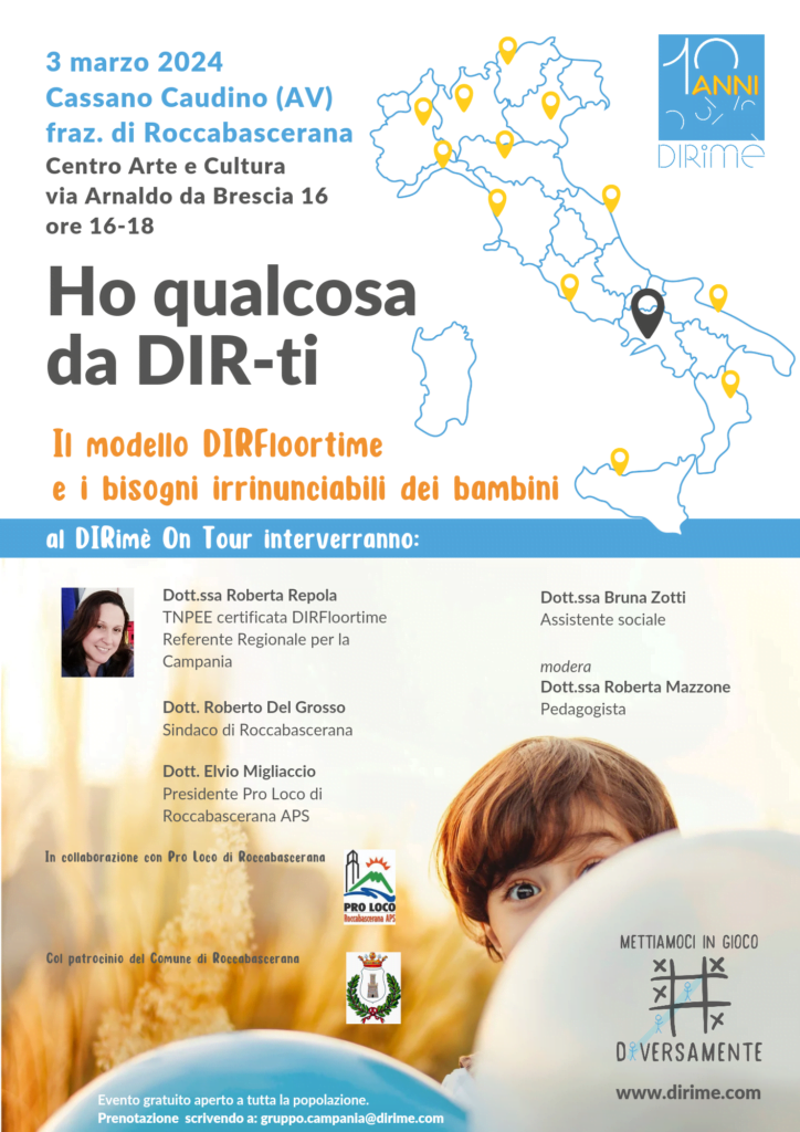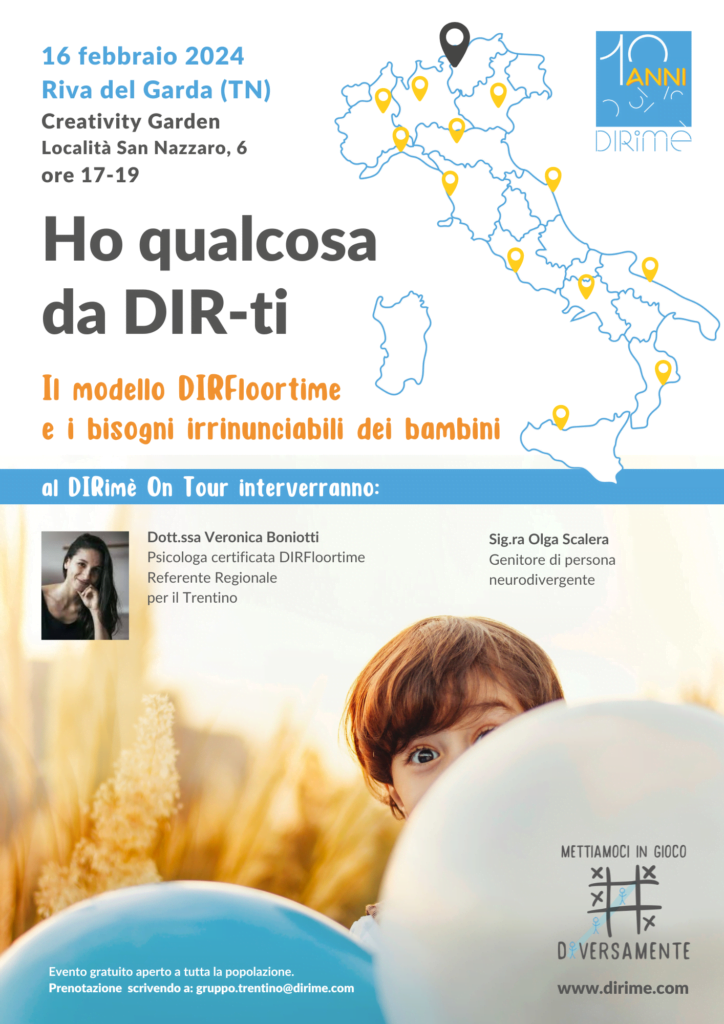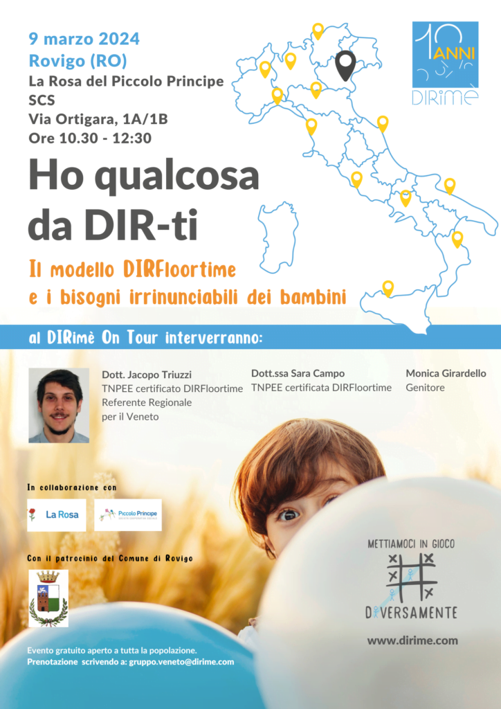 Nel 2024 la nostra Associazione festeggia il decennale e, per celebreare questo importante traguardo, abbiamo organizzato un tour DIRimè in varie regioni d’Italia. Si tratta di incontri gratuiti di sensibilizzazione DIRFloortime su tutto il territorio italiano con professionisti multidisciplinari, rappresentanti delle amministrazioni locali e famiglie che offrono la propria testimonianza diretta. Gli incontri sono aperti liberamente alla cittadinanza e in collaborazione con le realtà locali territoriali.