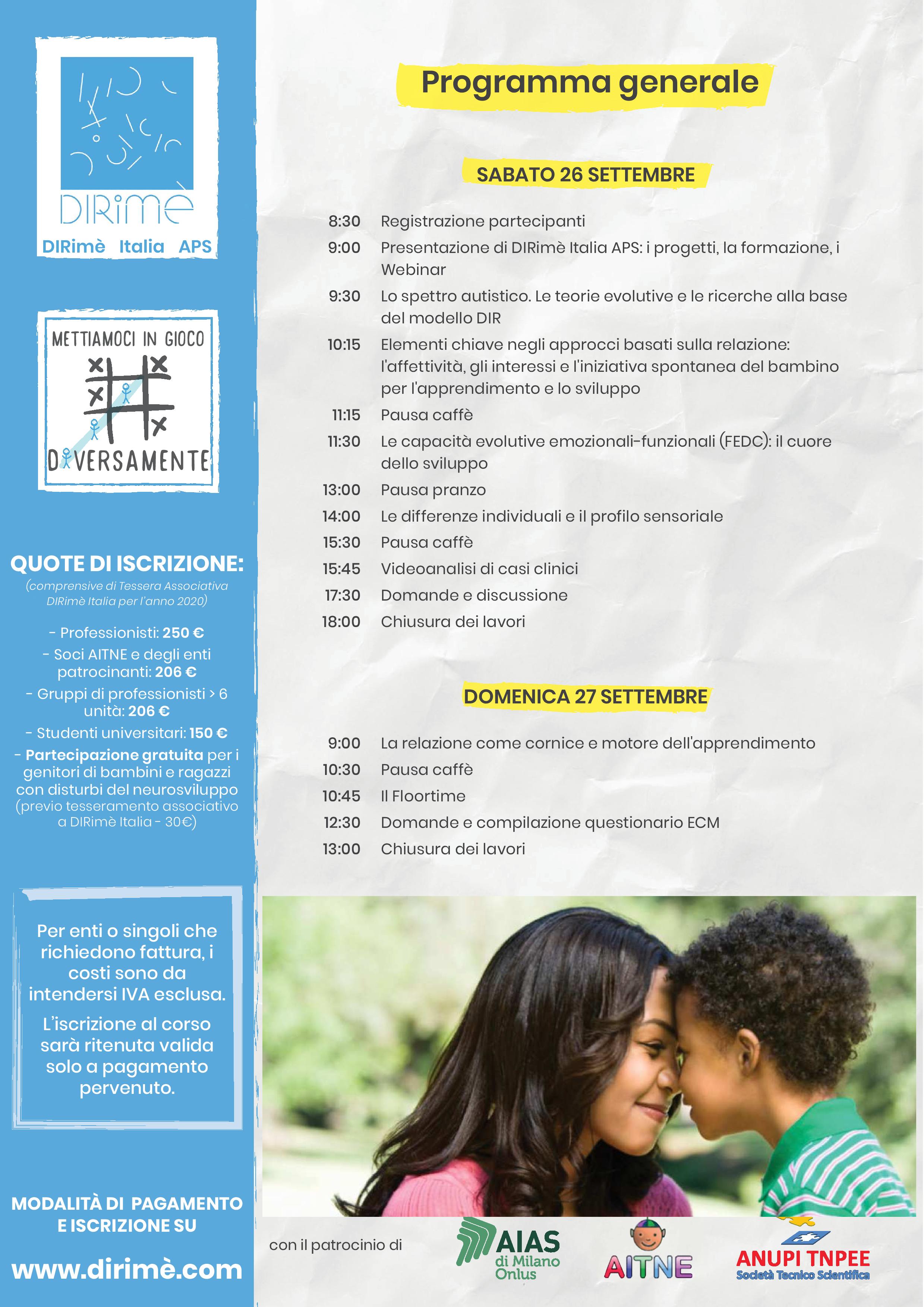 - Soci 2020 AIAS Milano, ANUPI Tnpee, AITO: 206 euro** (comprensivi di quota associativa come Socio DIRimè Italia 2020, 30 euro). **per usufruire della quota agevolata, inviare tessera 2020 dell’ente patrocinante a segreteria@dirime.com