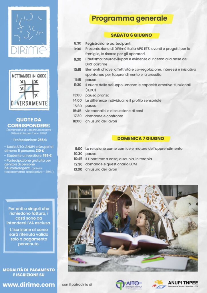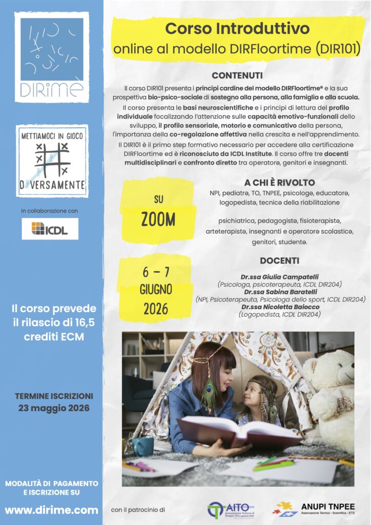 Il corso Introduttivo DIR101 al DIRFloortime presenta i principi cardine del modello DIRFloortime® e la sua prospettiva bio-psico-sociale di sostegno alla persona, alla famiglia e alla scuola.