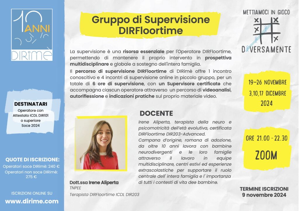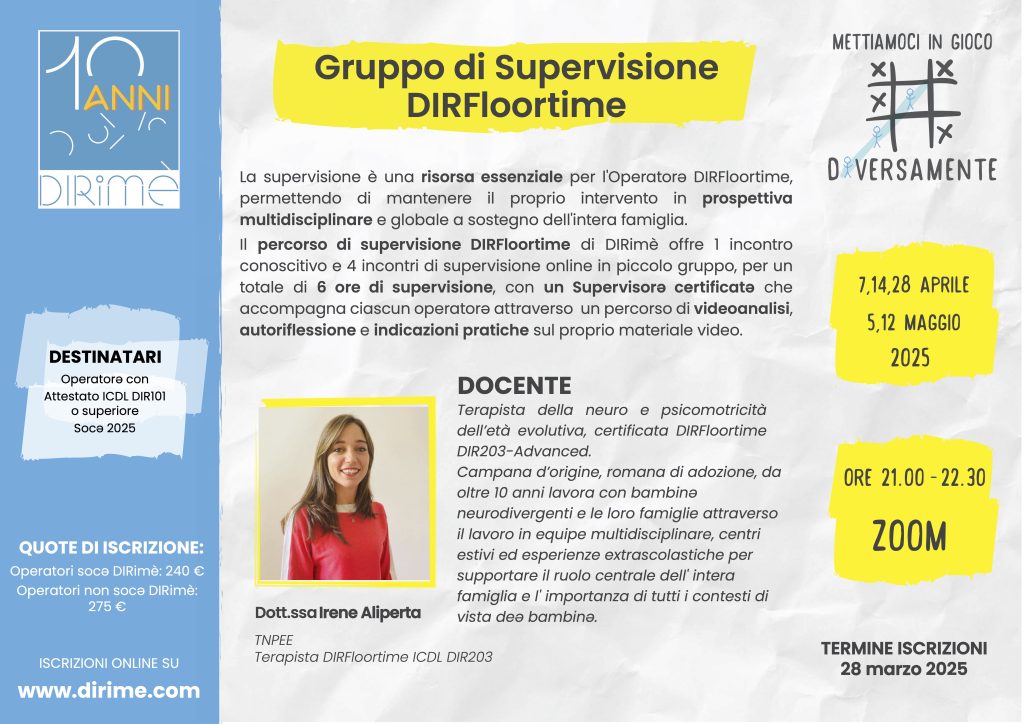 Il gruppo di supervisione DIRFloortime di DIRimè offre 1 incontro conoscitivo e 4 incontri di supervisione online in piccolo gruppo, per un totale di 6 ore di supervisione, con un Supervisorə certificatə che accompagna ciascun operatorə attraverso un percorso di videoanalisi, autoriflessione e indicazioni pratiche sul proprio materiale video.