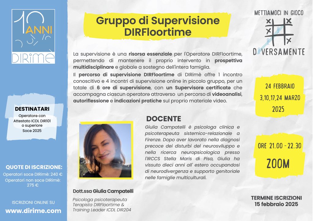 - Le iscrizioni sono attualmente chiuse per sold out. Se desideri iscriverti al prossimo gruppo di Supervisione contatta la Segreteria DIRimè al numero 379-1644669.