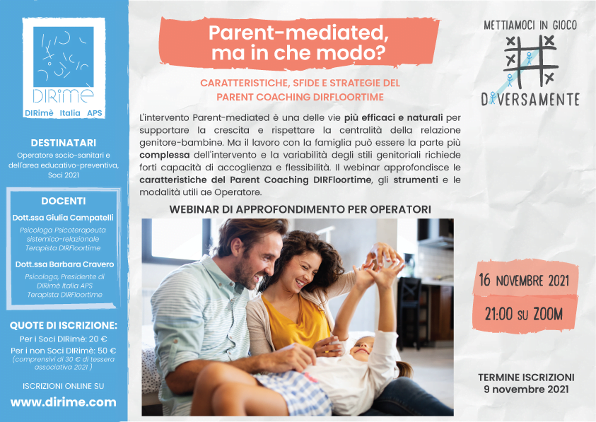 DIRimè Italia APS è lieta di patrocinare il Webinar “Regolazione e Co-regolazione: Teleriabilitazione e nuove opportunità di alleanza terapeutica con le famiglie” aperto a tutte le figure professionali delle aree socio-educative e riabilitative, in uno sforzo di confronto e crescita multidisciplinare a supporto dei profili individuali dei bambini e del pieno coinvolgimento genitoriale.