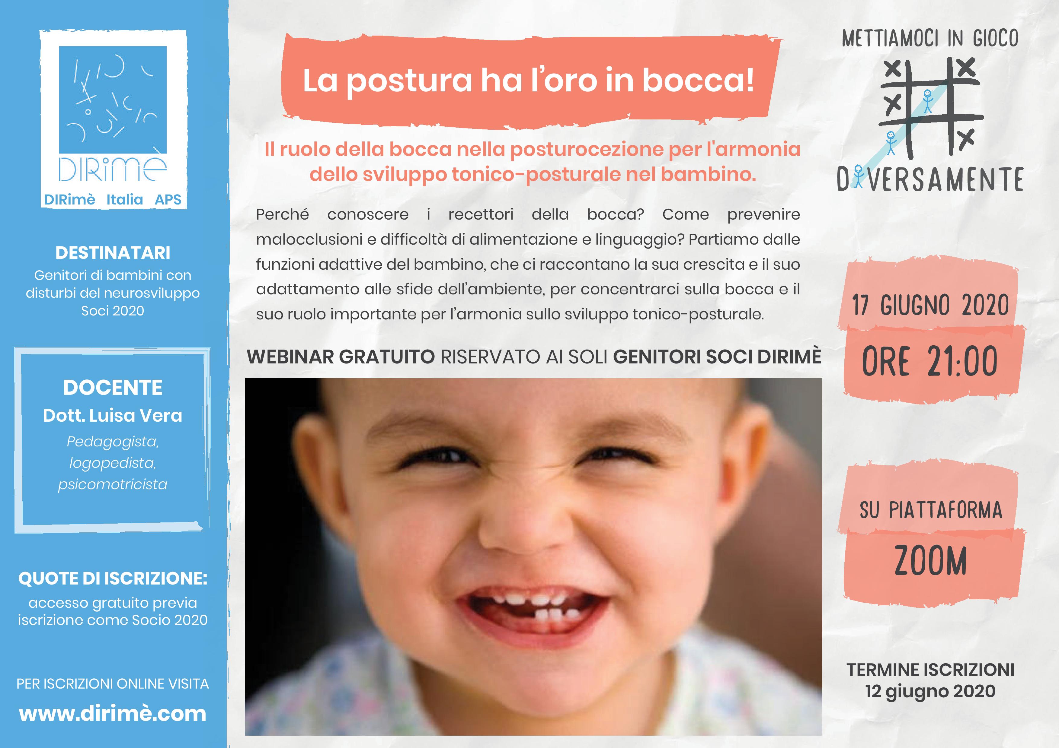 Nell’appuntamento di Giugno, parleremo di “La postura ha l’oro in bocca! Il ruolo della bocca nella posturocezione per l’armonia dello sviluppo tonico-posturale nel bambino”.